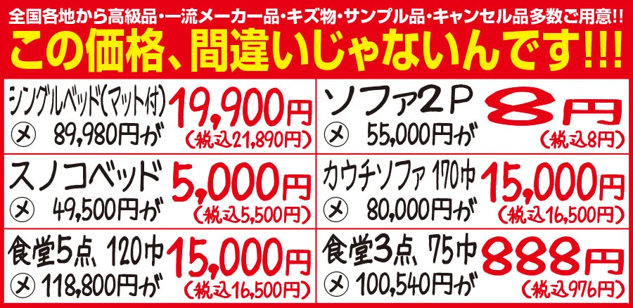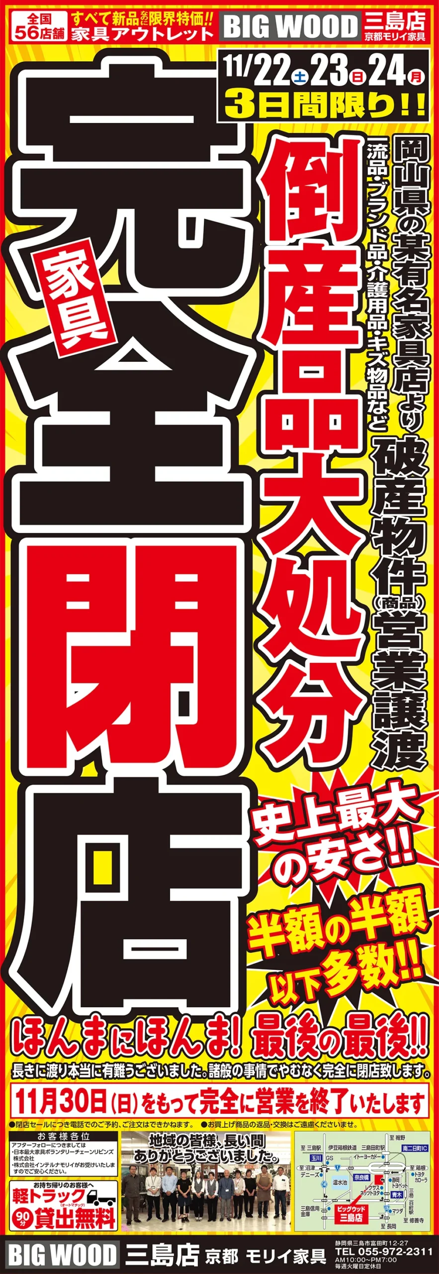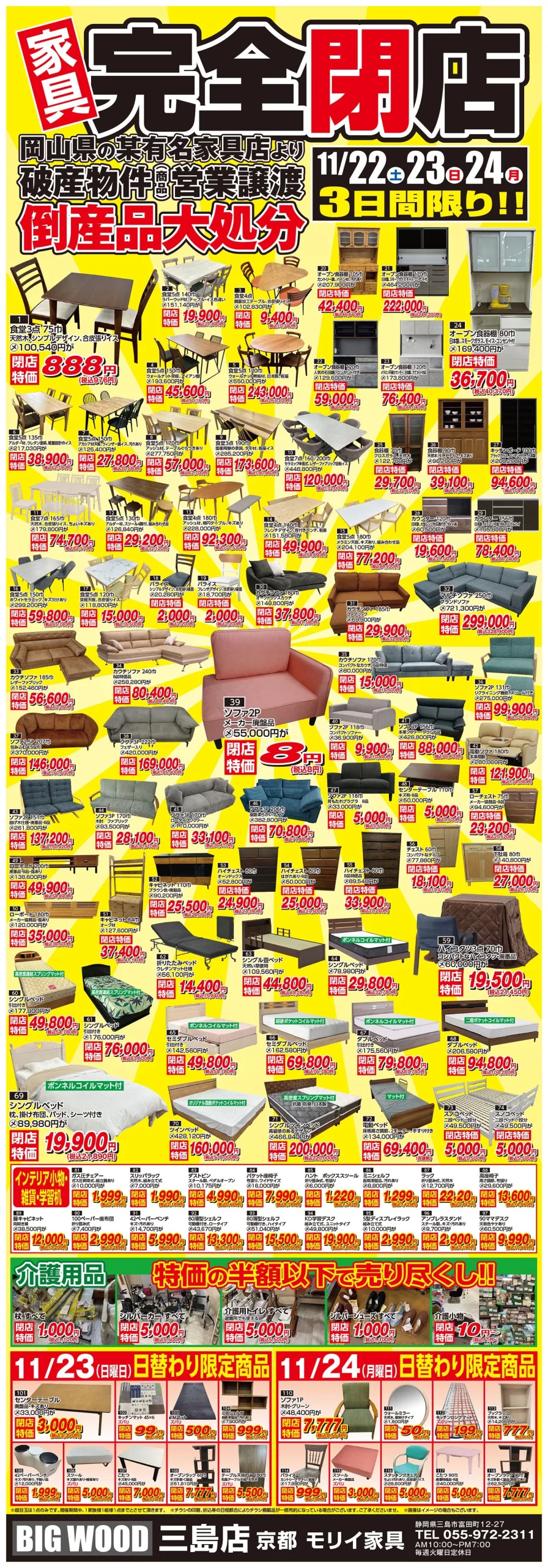 イベント案内 BIG WOOD三島店 京都モリイ家具 チラシを確認 お電話でのお問い合わせはこちらTEL.055-972-2311 11月22日(土)・23日(日)・24日(月)3日間限り アクセス情報 店名 BIG WOOD三島店 京都モリイ家具 住所 〒411-0836 静岡県三島市富田町12-27 電話番号 055-972-2311 営業時間 AM10:00~PM7:00 駐車場 完備 チラシ チラシをクリックすると拡大表示されます。